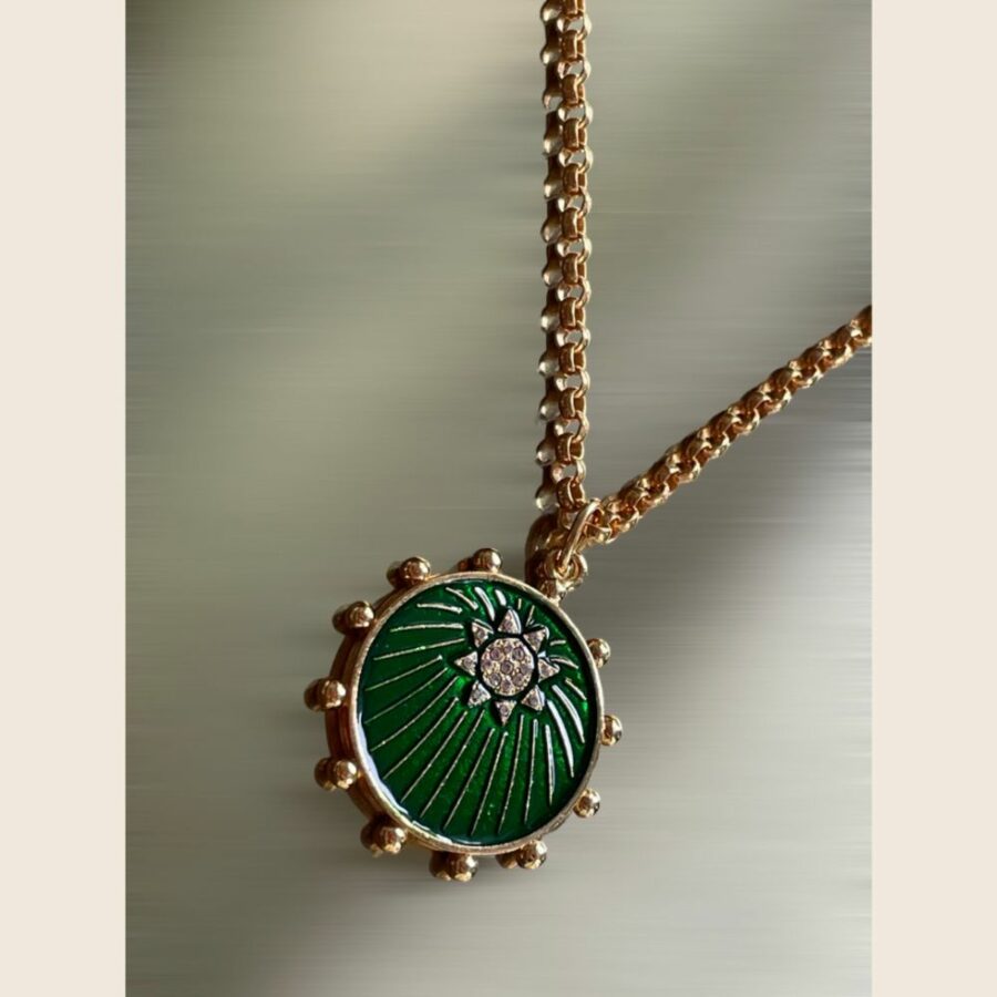 Collier composé d’une médaille émaillée vert et strassée à la main à Paris représentant un soleil avec de petits cristaux blancs. Dessinée, produite, dorée, émaillée et strassée artisanalement à Paris.