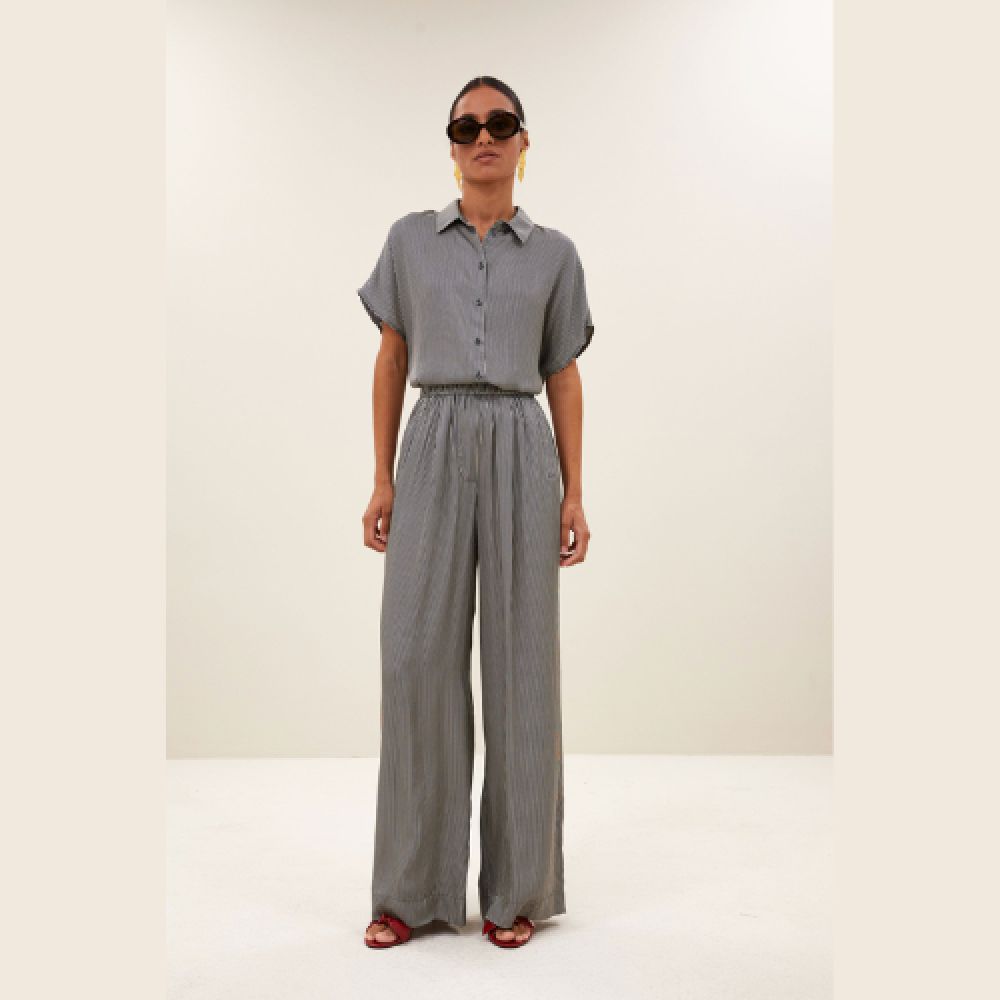 Le benji silky stripe pants offre une coupe décontractée confortable avec une taille haute flatteuse et une coupe ample. Ce pantalon long avec poches latérales et un élégant motif à rayures est parfait pour les journées détente où vous souhaitez rester soigné. Idéal pour ceux qui veulent allier confort et style.