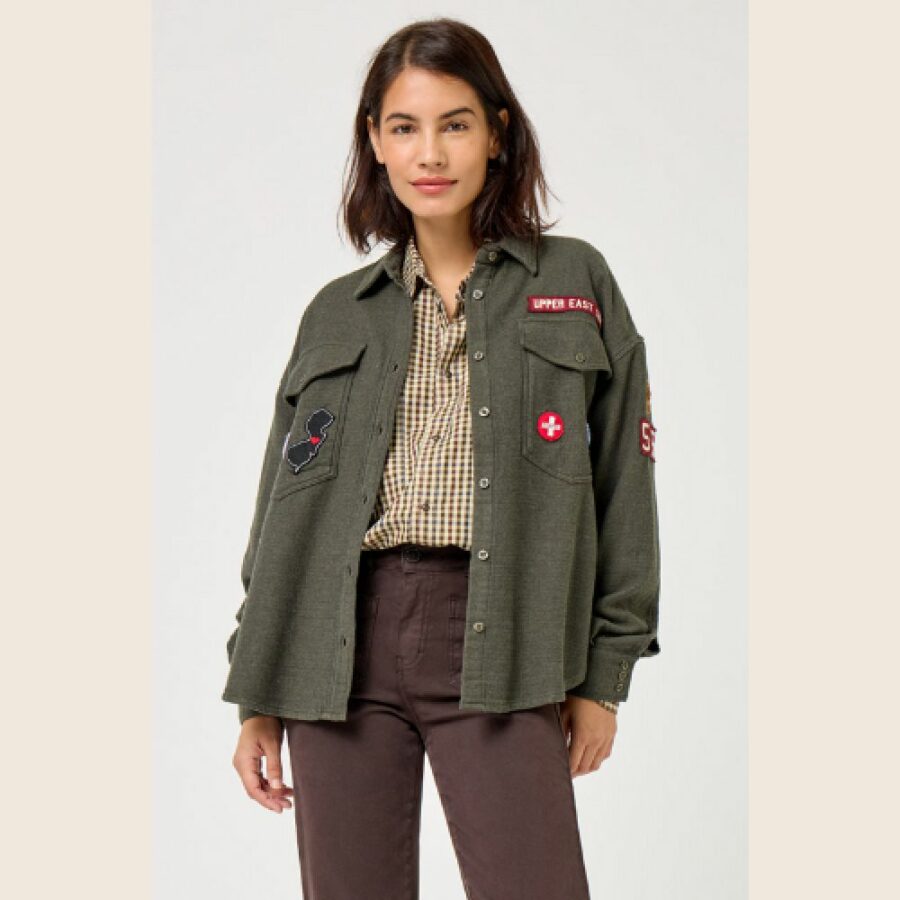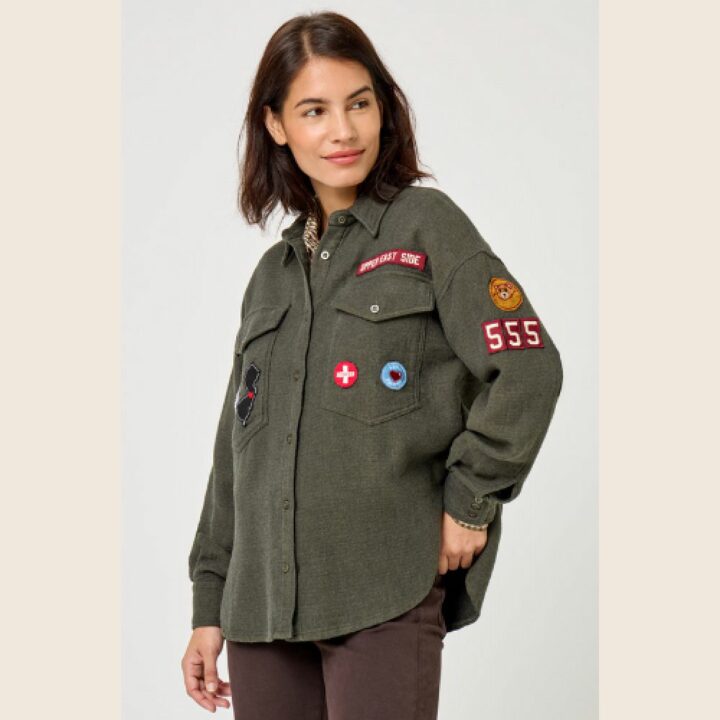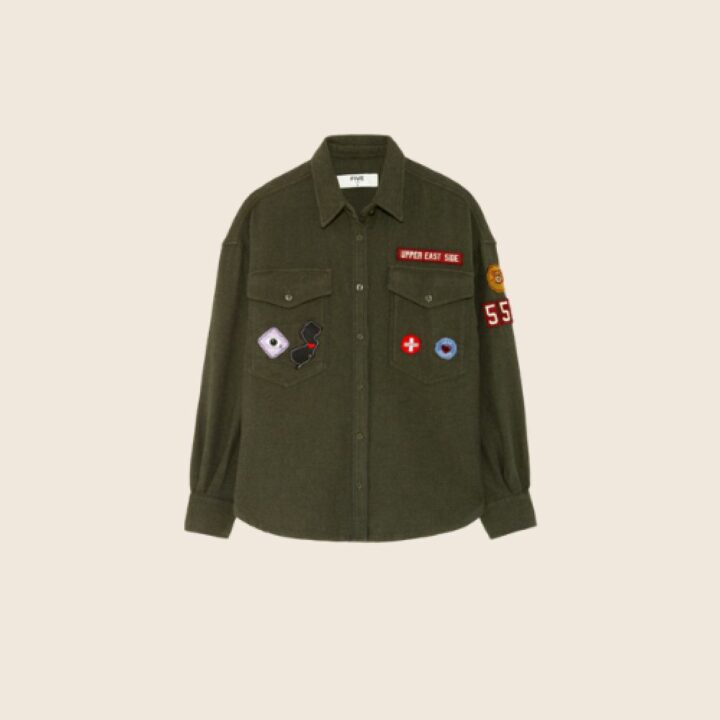 Les manches longues et les deux poches plaquées sur la poitrine structurent la silhouette, tandis que les badges décoratifs apportent une note d’originalité.