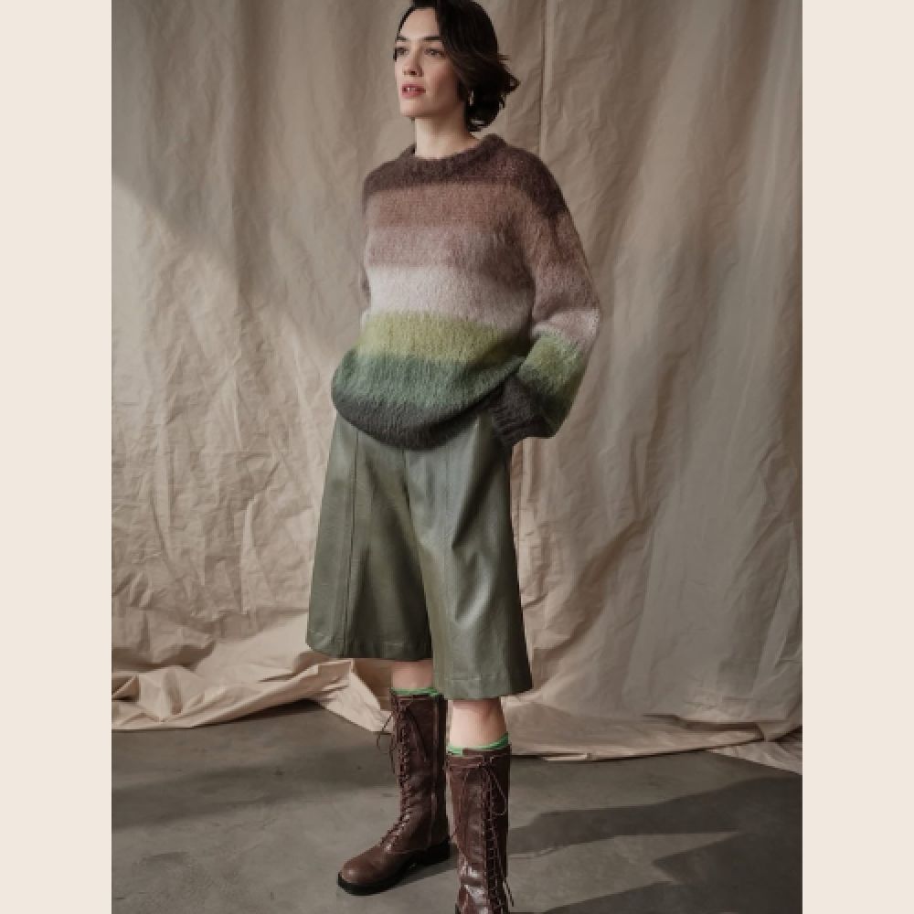**strong text**Textures raffinées, nuances terreuses et élégance intemporelle. Ce pull en maille au dégradé subtil se marie avec aisance à notre short en cuir à coupe ample, pour une allure à la fois sophistiquée et résolument naturelle.