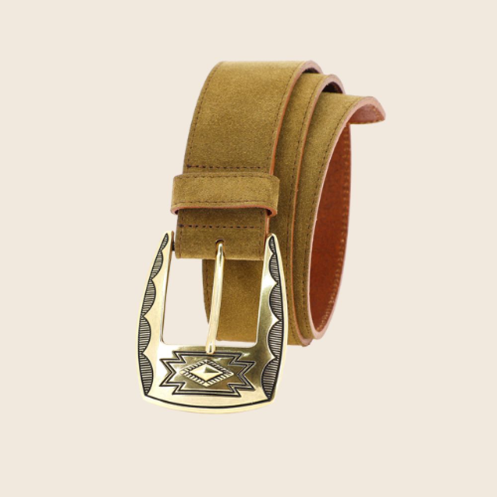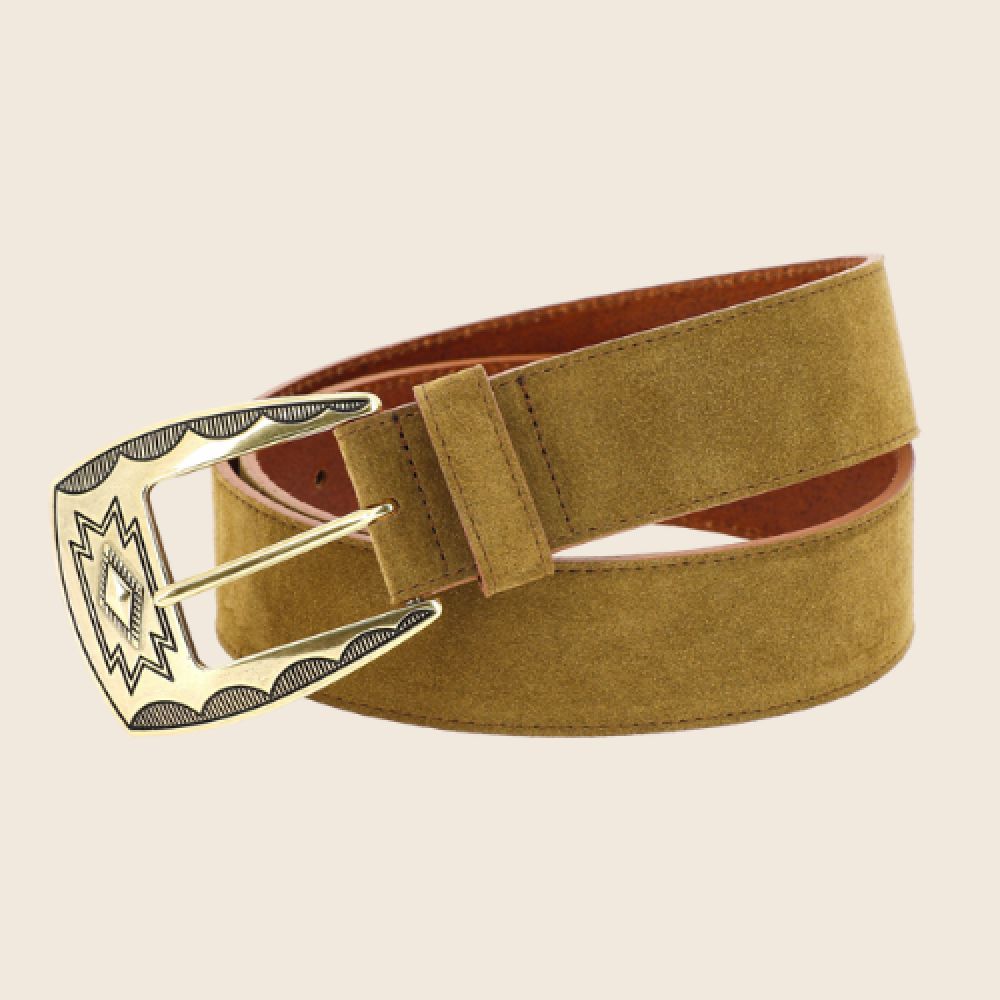 Ceinture d’exception de 40 mm de largeur, confectionnée en croûte de cuir velours coloris Tobacco et élégamment doublée en croûte de cuir pour une tenue impeccable dans le temps. Sa bijouterie dorée apporte une touche lumineuse et sophistiquée, soulignant un design à la fois épuré et raffiné.