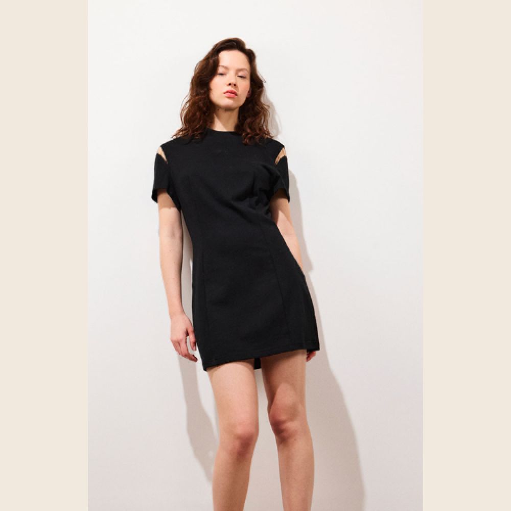 La robe courte DEUS est une pièce à la ligne nette, structurée sans rigidité, qui épouse le corps avec justesse. Sa coupe près du corps est dessinée par des pinces devant et dos pour une silhouette fluide et assumée. Aux épaules, les manches sont sublimées par de fines chaînes dorées, laissant apparaître la peau et créant un jeu subtil entre force et sensualité. Confectionnée en coton, elle se porte du matin au soir, en ville comme en soirée, selon l’allure que l’on choisit d’incarner. Une robe courte, puissante et contemporaine, pensée pour celles qui avancent avec assurance, naturellement.