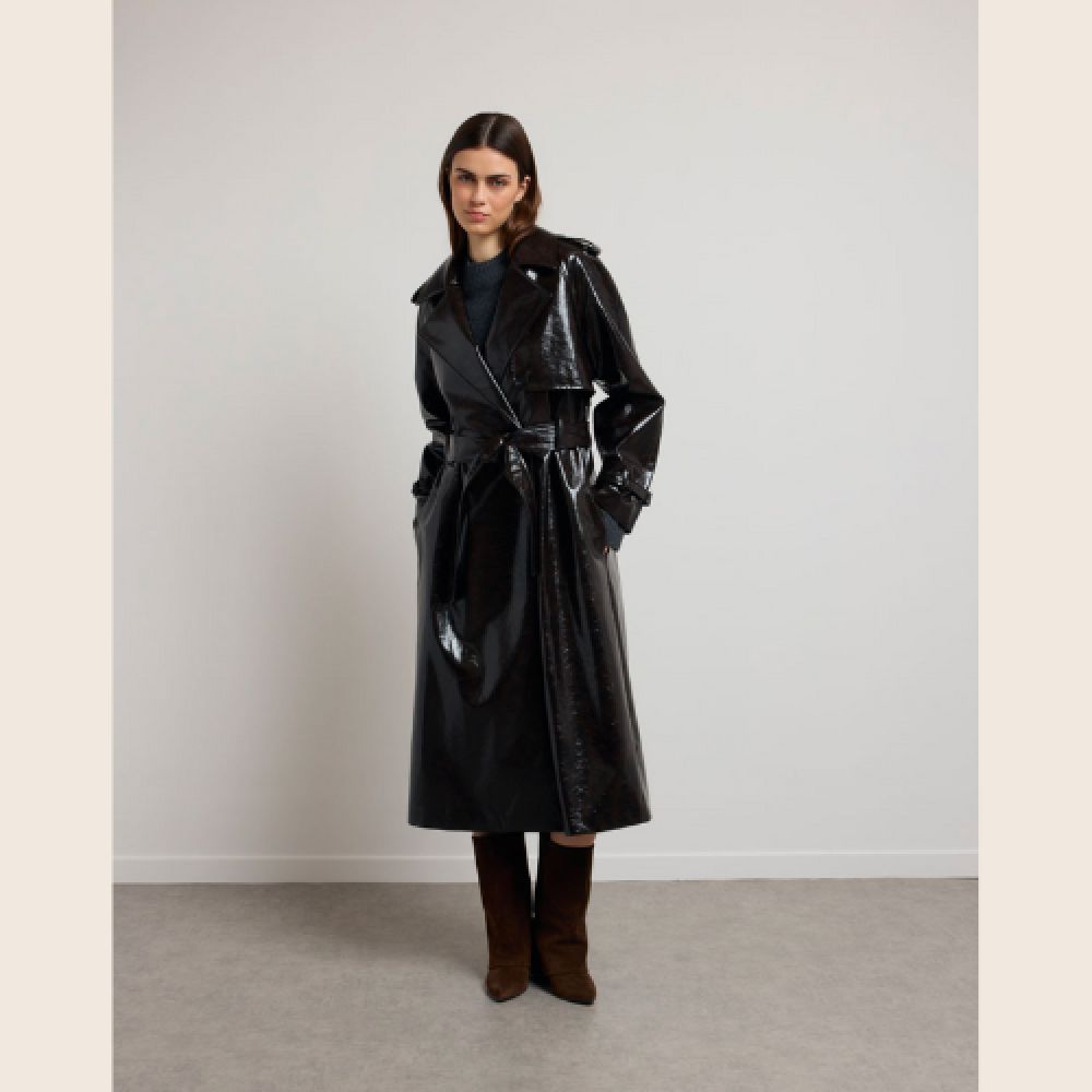 Le trench BASILE réinterprète les codes du caban classique à travers une vision audacieuse et contemporaine. Confectionné dans un vinyle brillant au tombé structuré, il impose une allure affirmée tout en captant la lumière avec subtilité.