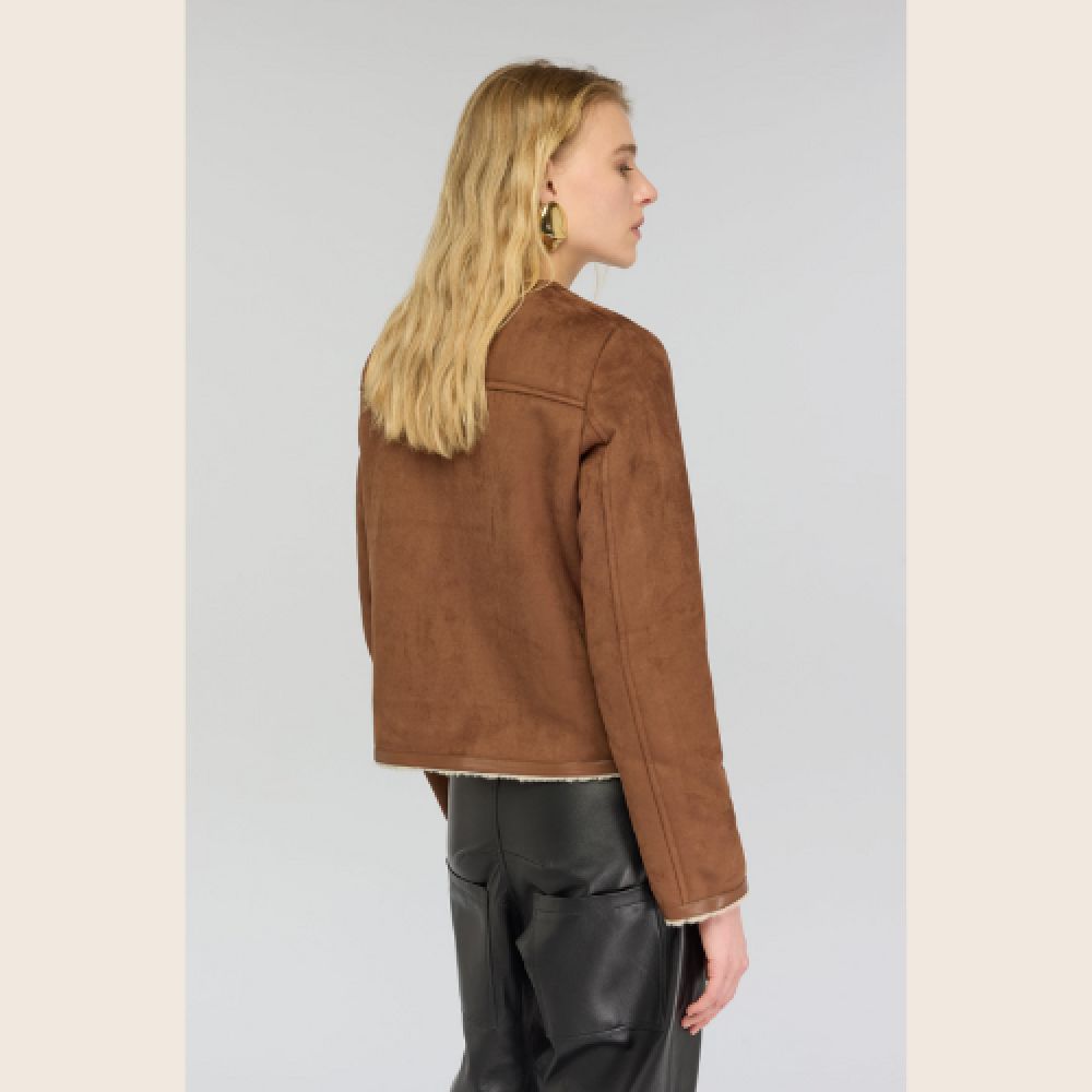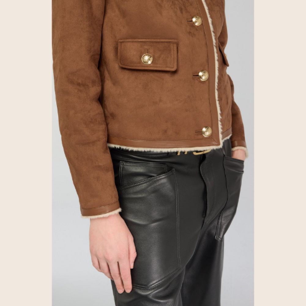 Inspirée de l’esthétique vintage du shearling, cette veste associe suédine douce et détails en similicuir pour une allure à la fois contemporaine et chaleureuse. Son col classique, sa fermeture boutonnée sur le devant et ses deux poches à rabat structurent la silhouette avec une élégance décontractée.