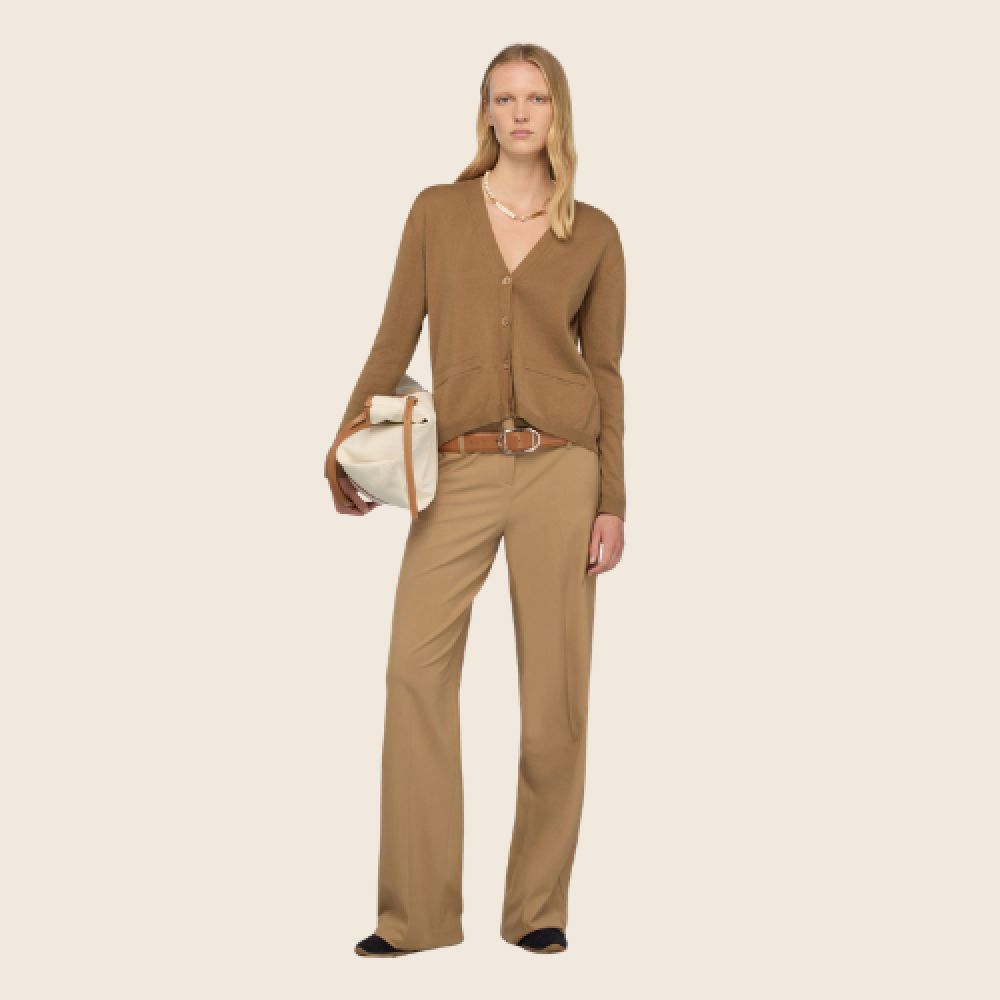 Cardigan en maille de coton avec détail en popeline à volants au dos. Deux détails de poches sur le devant. Fermeture sur le devant. Coupe classique.