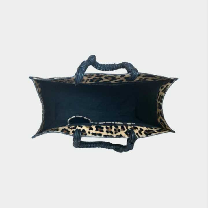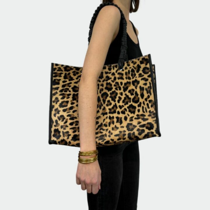 Sac en cuir de veau imprimé léopard, sublimé par des anses tressées et une doublure intérieure en coton.