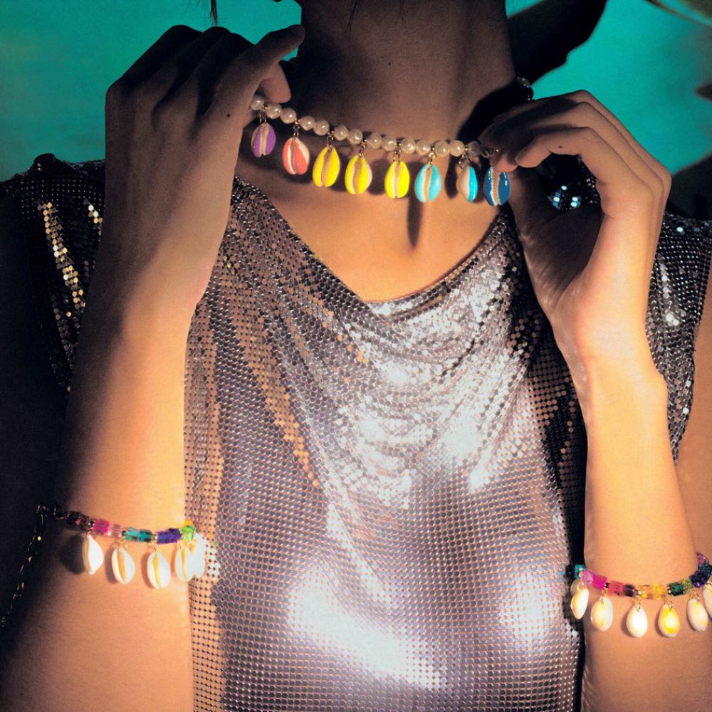 • Un mélange de perles de verre fines multi-couleurs, embellies par des petits coquillages cauris naturels.