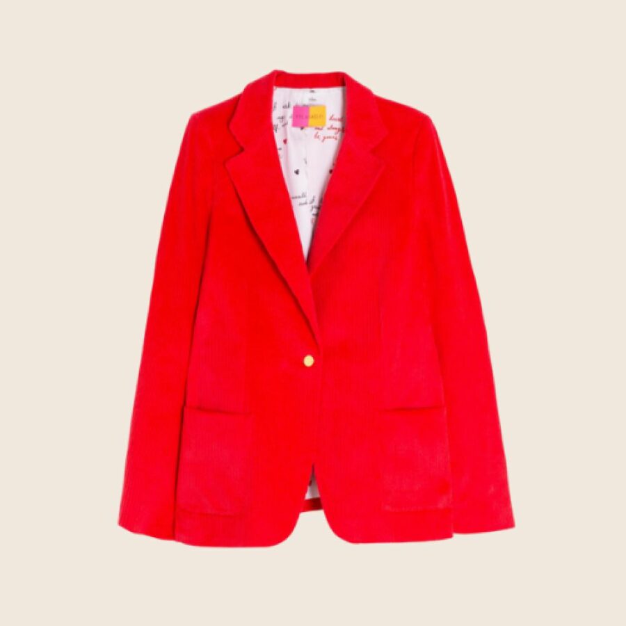 Katie nous a sélectionné cette veste en velours côtelé rouge avec revers classique. Coupe droite avec une finition légèrement arrondie à l’ourlet, elle incarne l’équilibre parfait entre élégance intemporelle et modernité assumée. Les poches visibles à l’avant ajoutent une touche de caractère tout en conservant une esthétique raffinée. Confectionnée dans un tissu à la structure marquée et à la finition douce, cette pièce offre un tombé impeccable et un confort luxueux. Une veste au charme affirmé, idéale pour sublimer vos tenues, du bureau aux soirées les plus sophistiquées.