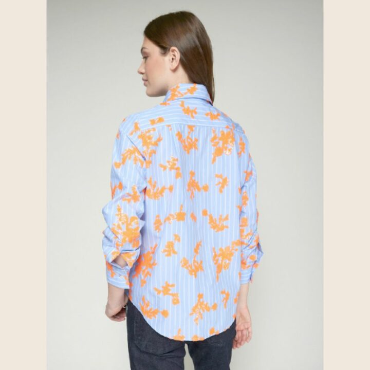 Cette chemise à fines rayures bleues mêle subtilité classique et éclat contemporain. Sa coupe droite, associée à un ourlet arrondi et un col classique, offre une silhouette élégante et facile à porter. Sur le devant, des broderies florales se détachent avec éclat grâce à des paillettes orange fluo, apportant une touche de lumière et d’originalité au tissu rayé. Les poignets boutonnés et la fermeture frontale à boutons visibles viennent parfaire ce modèle au charme délicat. Confectionnée dans un tissu fluide et doux, cette pièce a été sélectionnée par Katie pour son jeu de contrastes entre raffinement intemporel et détails lumineux.