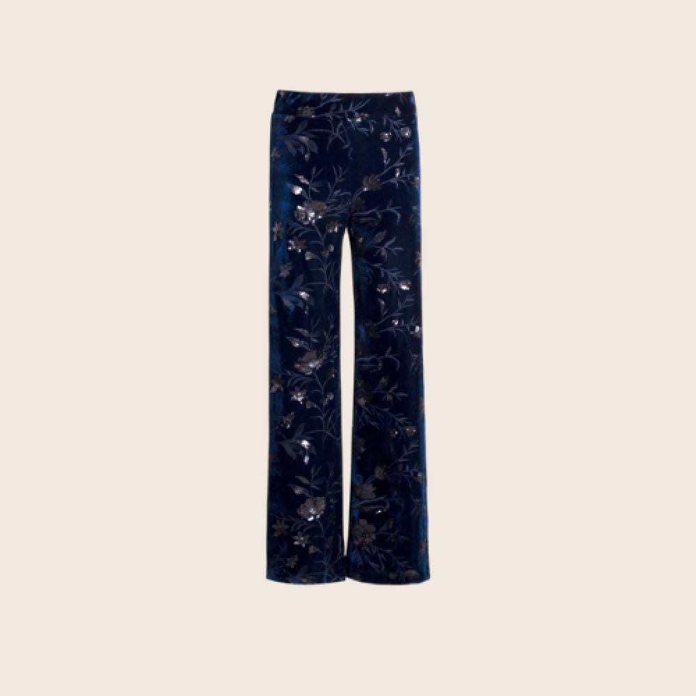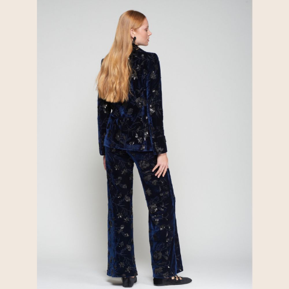 Ce pantalon en velours bleu marine séduit par son raffinement subtil et ses broderies florales en relief, rehaussées de fines paillettes noires qui captent la lumière avec élégance.