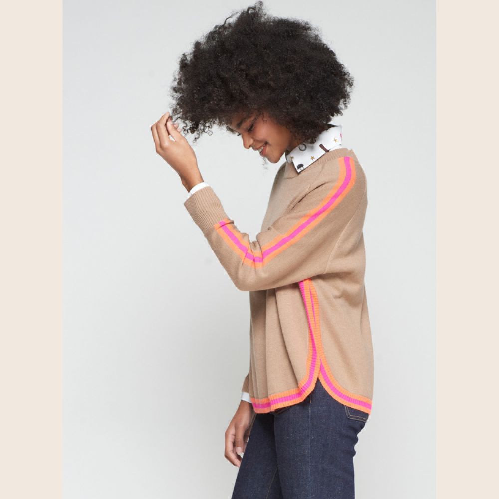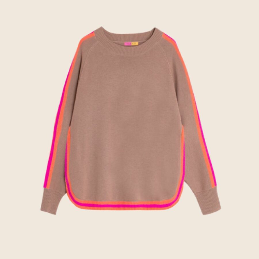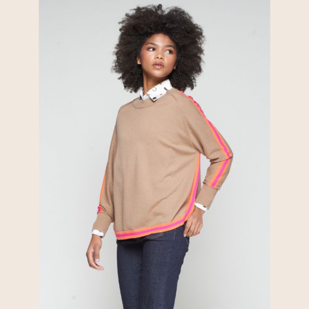 Dans cette sélection, découvrez ce pull en maille camel à l’allure audacieuse et raffinée. Sa coupe ample et son tricot doux, réalisé dans un mélange de laine, offrent un confort enveloppant tout en conservant une belle tenue. L’ourlet arrondi est rehaussé d’une bordure côtelée contrastante dans des tons fuchsia et orange, apportant une touche de modernité et de caractère. Les manches longues sont soulignées d’une bande de couleur fluo, en harmonie avec la bordure, pour un effet graphique subtil. Le col rond, accompagné de finitions côtelées, vient parfaire cette pièce à l’élégance contemporaine. Un pull sélectionné par Katie pour son style vibrant et sa maille luxueuse.