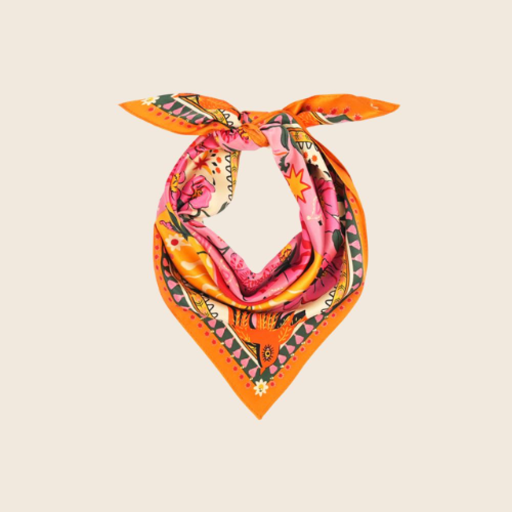 Articulé autour d’une étoile stylisée, l’imprimé BANDIDAS reprend les codes classiques du bandana — comme le motif paisley — et les réinvente en y mêlant un tigre docile et coloré, des fleurs estivales et des éléments d’esthétique mexicaine. Le résultat : une version girly aux influences multiples et lointaines. Décliné en trois couleurs, il est ici dans sa version rose avec des nuances de jaune, orange, rose, fuchsia, blanc et rouge.